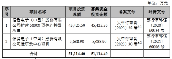 信音电子于2023年7月7日发布的招股说明书显示,公司拟募集资金51,114.40万元,分别用于信音电子(中国)股份有限公司扩建58000万件连接器项目、信音电子(中国)股份有限公司建研发中心项目。