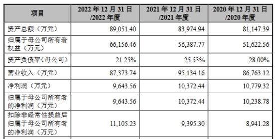 2020年至2022年,信音电子实现营业收入分别为86,763.12万元、95,134.16万元、87,373.74万元,实现净利润分别为10,779.32万元、10,372.44万元、9,643.56万元,归属于母公司所有者的净利润分别为10,238.78万元、10,372.44万元、9,643.56万元,实现扣除非经常性损益后归属于母公司所有者的净利润分别为8,941.28万元、9,395.30万元、11,105.23万元。