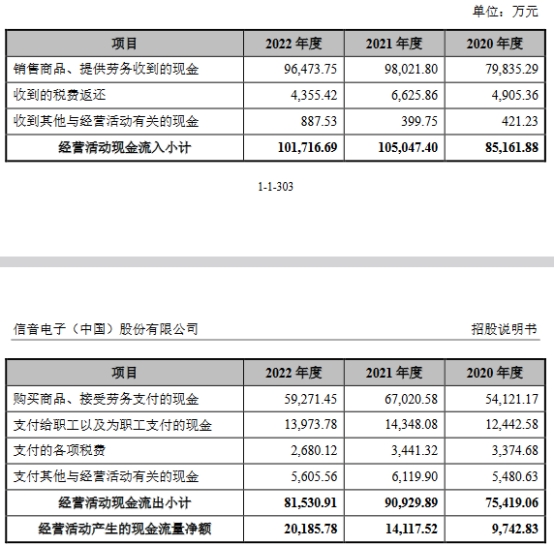 上述同期,公司经营活动产生的现金流量净额分别为9,742.83万元、14,117.52万元、20,185.78万元,销售商品、提供劳务收到的现金分别为79,835.29万元、98,021.80万元、96,473.75万元。