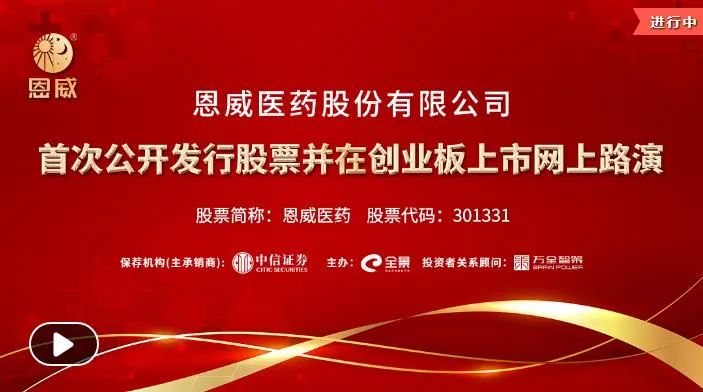 9月5日,恩威医药股份有限公司首次公开发行股票并在创业板上市发行公告在《证券日报》等媒体刊出,并举行在创业板上市网上路演,恩威医药董事长、首席执行官薛永江、公司副总裁、董秘周爱群、财务总监胡大伟与中信证券保荐代表人出席活动。