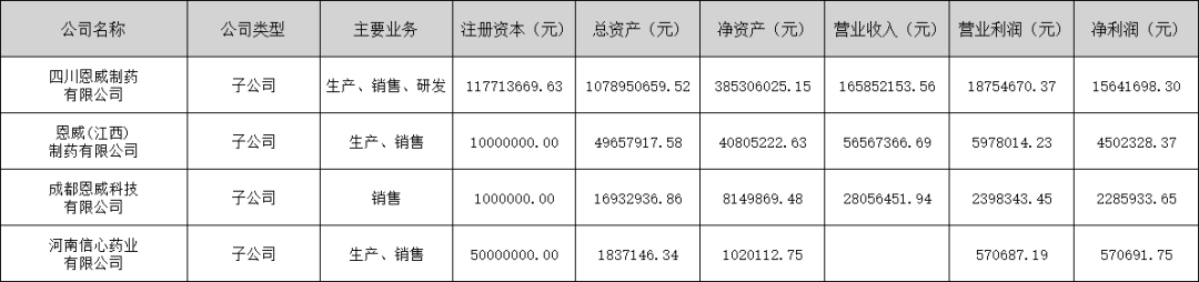 6,恩威的主要产品及收入来自于四川恩威制药、恩威江西、成都恩威科技、河南信心药业四家100%控股子公司,四川恩威从事药品、卫生用品、消毒用品等生产;恩威(江西)从事合剂、口服液、口服溶液剂、糖浆剂、煎膏剂业务;成都恩威科技从事卫生用品、化妆品、日用品、医疗器械的销售。河南信心药业从事片剂、颗粒剂、散剂、丸剂、合剂、糖浆剂、煎膏剂的生产。