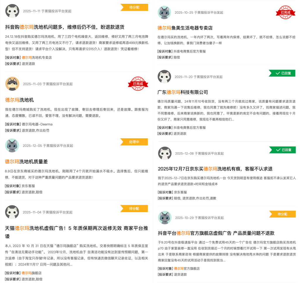 与此同时, 德尔玛 也在积极发展其自有品牌“ 德尔玛 ”,旗下产品线已覆盖吸尘器、洗地机、净饮机、按摩仪等多个小家电品类。然而,在黑猫投诉等第三方消费者服务平台,涉及 德尔玛 洗地机漏水、电池续航短、电机异响等质量问题的用户投诉时有出现。