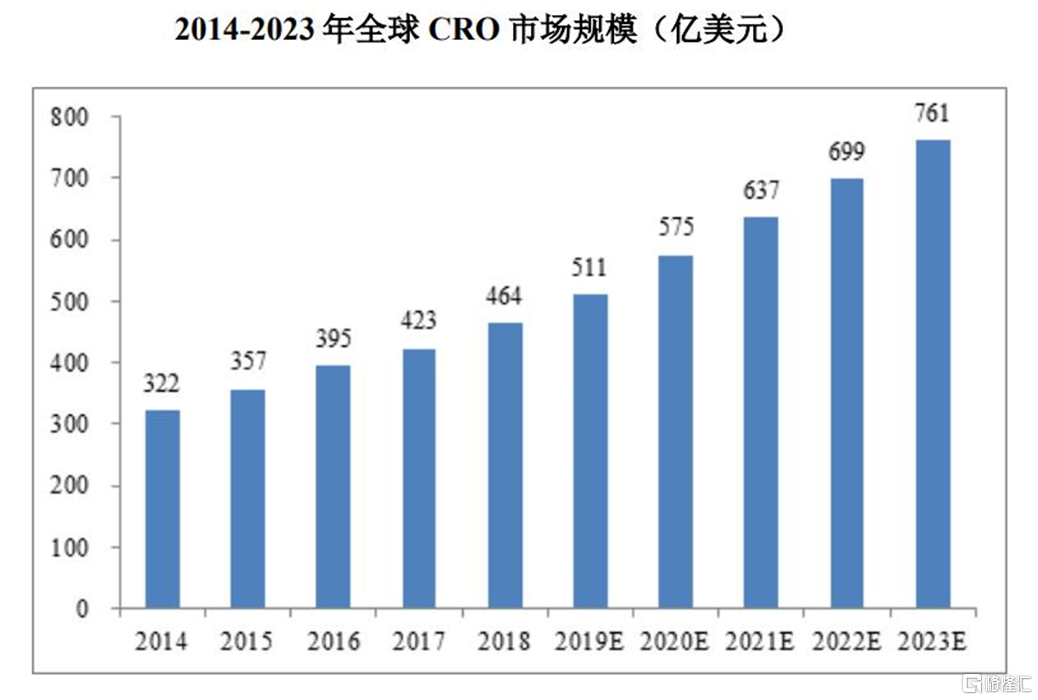 预计2023年全球 CRO市场规模将达 761 亿美元,其中临床研究阶段 CRO 市场规模约为 625 亿美元。