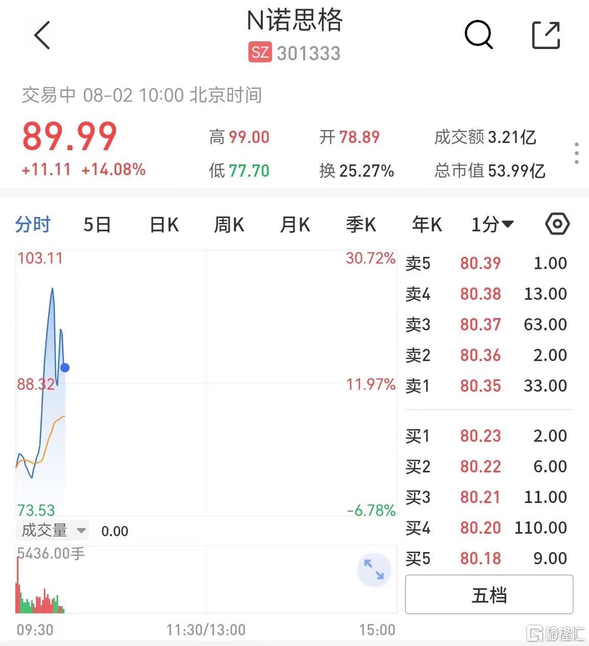 今日诺思格高开0.01%,盘中波动较大,先是微涨2%左右,随即破发后股价直线拉升,最高至99元/股,较发行价上涨25.5%,最新市值超50亿元。
