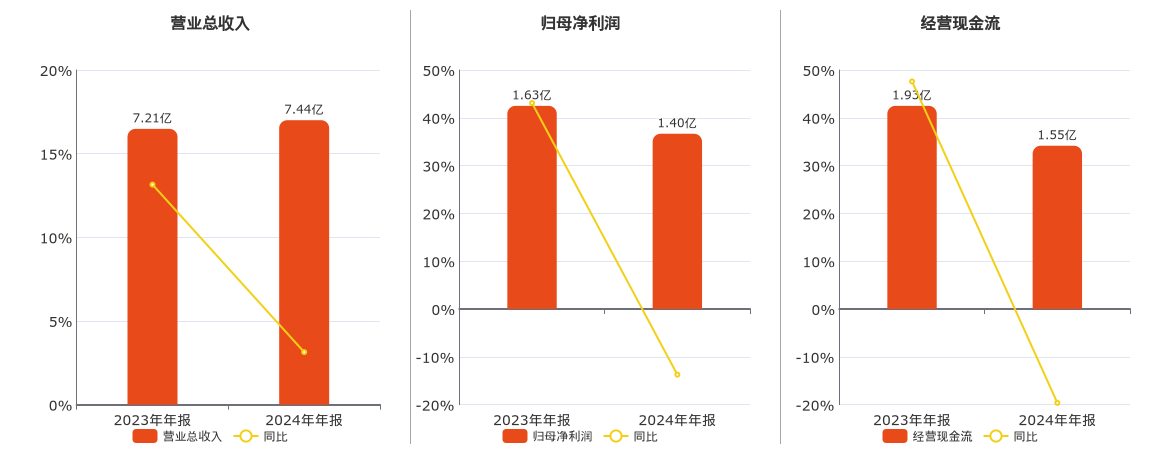 公司营业总收入为7.44亿元。归母净利润为1.40亿元,较去年同报告期归母净利润减少2231.12万元,同比较去年同期下降13.73%。经营活动现金净流入为1.55亿元,较去年同报告期经营活动现金净流入减少3780.17万元,同比较去年同期下降19.63%。