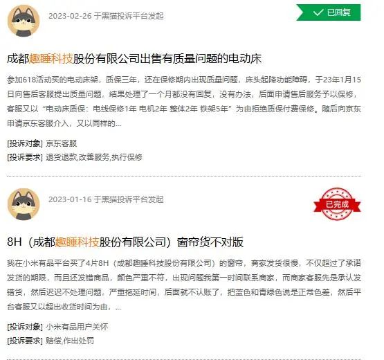 2022年8月,趣睡科技收到杭州市中级法院的民事判决书,被要求立即停止在“8H 官网趣睡科技”、小米商城等线上渠道销售带有“8H”标识的侵权商品。