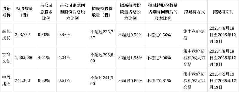 9月15日,趣睡科技公告披露了3位股东:石河子市尚势成长股权投资合伙企业(有限合伙)、成都宽窄文创产业投资集团有限公司、宁波潘火创新产业引导股权投资合伙企业(有限合伙)的减持计划。合计拟减持比例不超过约125.86万股,占总股本比例不超过3.14%