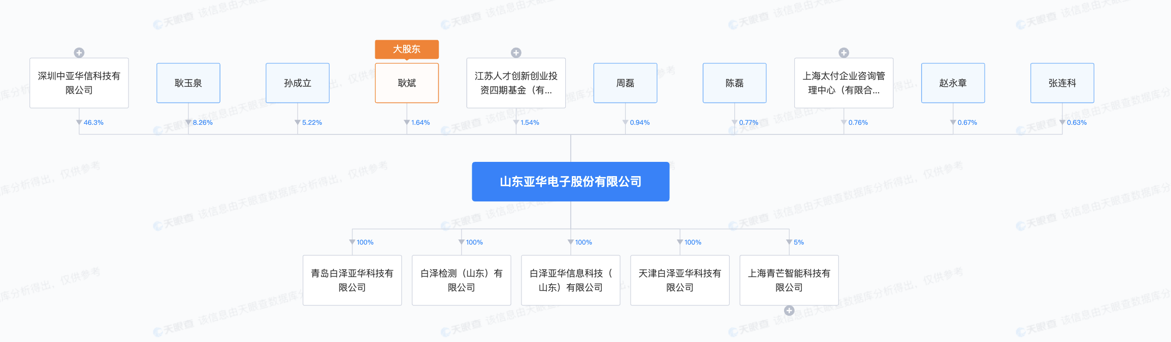 信息显示,亚华电子成立于1998年,系深圳中亚华信科技成员,位于山东省淄博市,前身为淄博亚华电子有限公司。目前,该公司的注册资本为7815万元,法定代表人为耿玉泉,股东包括深圳中亚华信科技、耿玉泉、孙成立等。