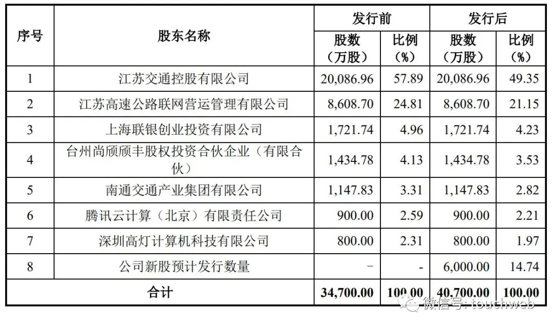 IPO前,江苏交通控股有限公司直接持股为57.89%,江苏高速公路联网营运管理有限公司持股为24.81%,上海联银创业投资有限公司持股为4.96%,台州尚颀颀丰股权投资合伙企业(有限合伙)持股为4.13%;