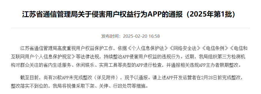 刚刚,江苏省通信管理局发布了2025年第1批关于侵害用户权益行为APP的通报。