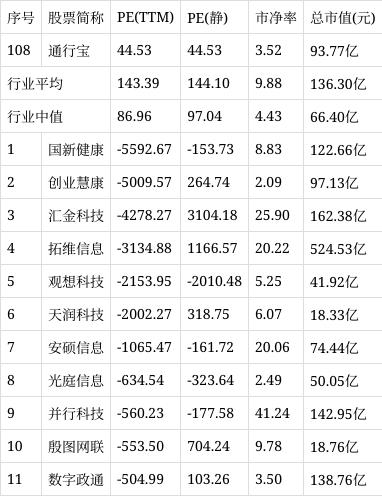 从行业市盈率排名来看,公司所处的软件开发行业市盈率平均143.39倍,行业中值86.96倍,通行宝排名第108位。