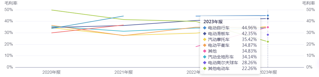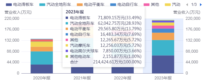 2023年,公司实现营收21.4亿元,同比增长21.4%。分品类来看,电动滑板车实现销售收入71,809.15万元,同比增长4.52%;电动自行车实现销售收入16,483.34万元,同比增长111.11%;全地形车实现销售收入62,042.75万元,同比增长21.21%。