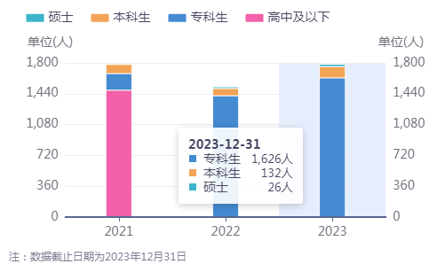相比同行其他上市公司,涛涛车业在研发投入和技术创新能力处于弱势地位。2023年年报显示,公司绝大多数为专科生,且研发费用率较低。