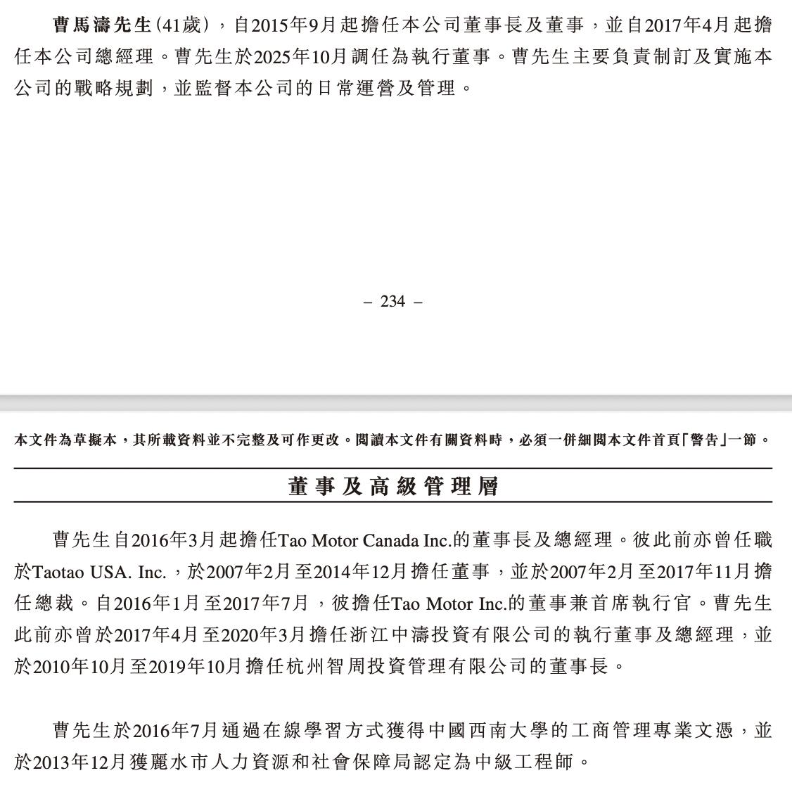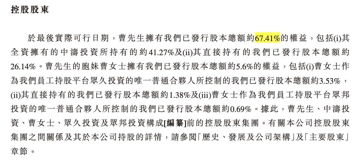 曹马涛的胞妹曹侠淑拥有公司已发行股本总额约5.6%的权益,包括曹侠淑作为员工持股平台 众久投资 的唯一普通合伙人所控制的公司已发行股本总额约3.53%,其直接持有的公司已发行股本总额约1.38%及曹侠淑作为员工持股平台 众邦投资 的唯一普通合伙人所控制的公司已发行股本总额约0.69%。