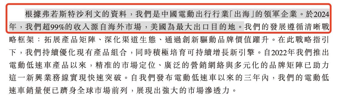 值得一提的是,根据弗若斯特沙利文的资料, 涛涛车业 是中国电动出行行业“出海”的领军企业。于2024年,公司超99%的收入源自海外市场,美国为最大出口目的地。