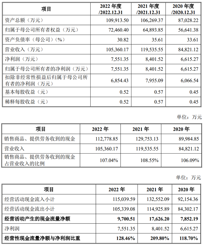 上述同期,公司销售商品、提供劳务收到的现金分别为89,984.85万元、129,753.13万元和112,778.85万元;经营活动产生的现金流量净额分别为7,852.19万元、17,626.20万元、9,700.51万元。