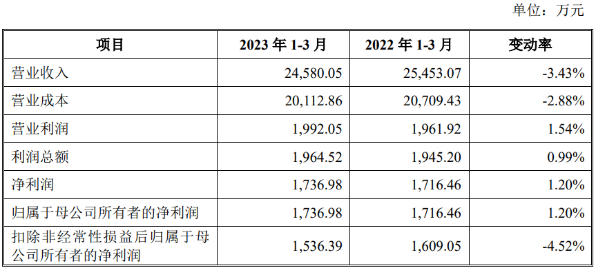 2023年1-3月,南王科技的营业收入为24,580.05万元,同比下降3.43%;净利润/归属于母公司所有者的净利润为1,736.98万元,同比增长1.20%;扣除非经常性损益后归属于母公司所有者的净利润1,536.39万元,同比下降4.52%。