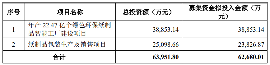 南王科技本次发行募集资金总额为85,608.90万元,扣除发行费用后实际募集资金净额为77,380.83万元。公司最终募集资金净额比原计划多14,700.82万元。南王科技2023年6月6日披露的招股说明书显示,公司拟募集资金62,680.01万元,用于年产22.47亿个绿色环保纸制品智能工厂建设项目、纸制品包装生产及销售项目。