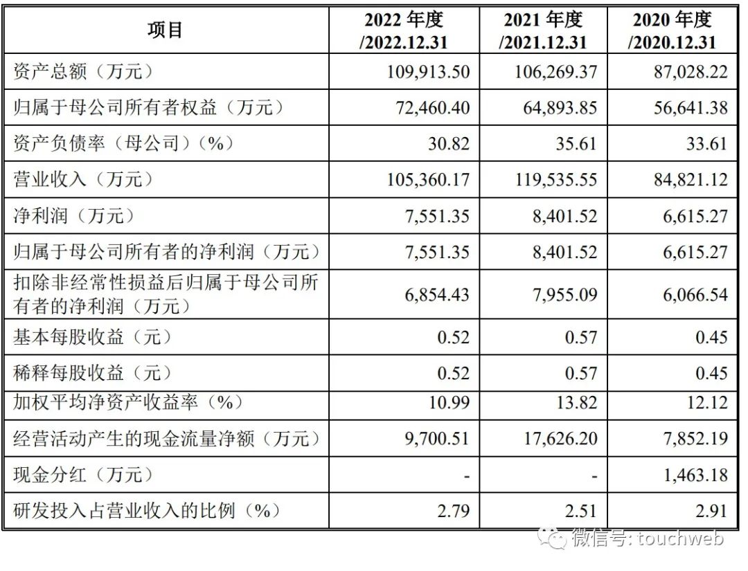 招股书显示,南王科技2020年、2021年、2022年营收分别为8.48亿元、11.95亿元、10.54亿元;净利分别为6615万元、8401.5万元、7551万元;扣非后净利分别为6066.54万元、7955万元、6854万元。