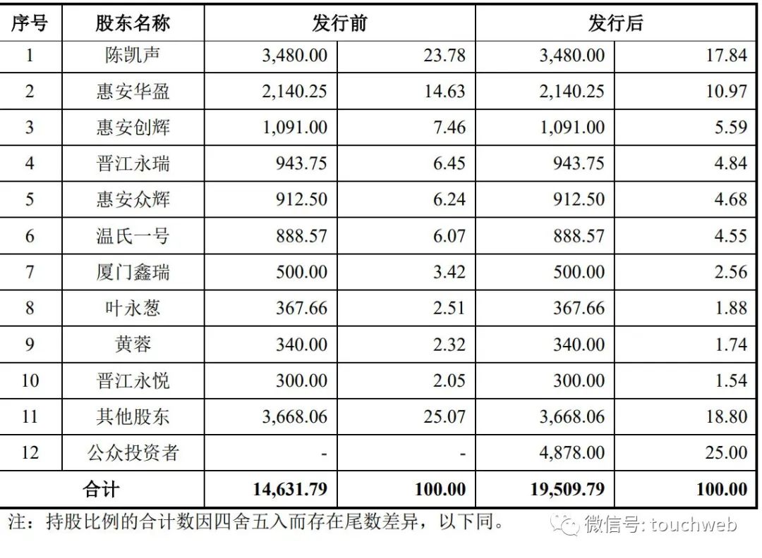IPO后,陈凯声直接持股为17.84%,惠安华盈持股为10.97%,惠安创辉持股为5.59%,晋江永瑞持股为4.84%,惠安众辉持股为4.68%;
