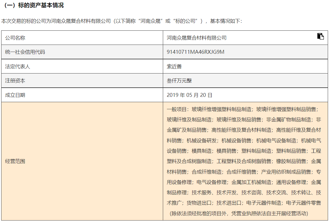 公开资料显示,标的公司河南众晟成立于2019年,注册资本3000万元,是一家专注于玻璃钢拉挤设备、拉挤模具、复合材料制品及技术为一体的综合性企业,主要产品有玻璃钢拉挤型材、玻璃钢拉挤模具、玻璃钢拉挤设备三大业务板块,公司是国家高新技术企业。