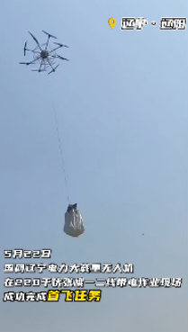 5月22日,国网辽宁电力一架搭载绝缘遮蔽用具的八旋翼无人机在220千伏张峨一二线带电作业现场,成功完成首飞任务。无人机平稳穿越复杂地形,将100公斤带电作业物资从山下运至山顶。此次应用解决了山区复杂地形大重量物资运输难题,实现了复杂环境下无人机载重运输的里程碑式突破,是“空-天-地”抢修模式的创新实践。