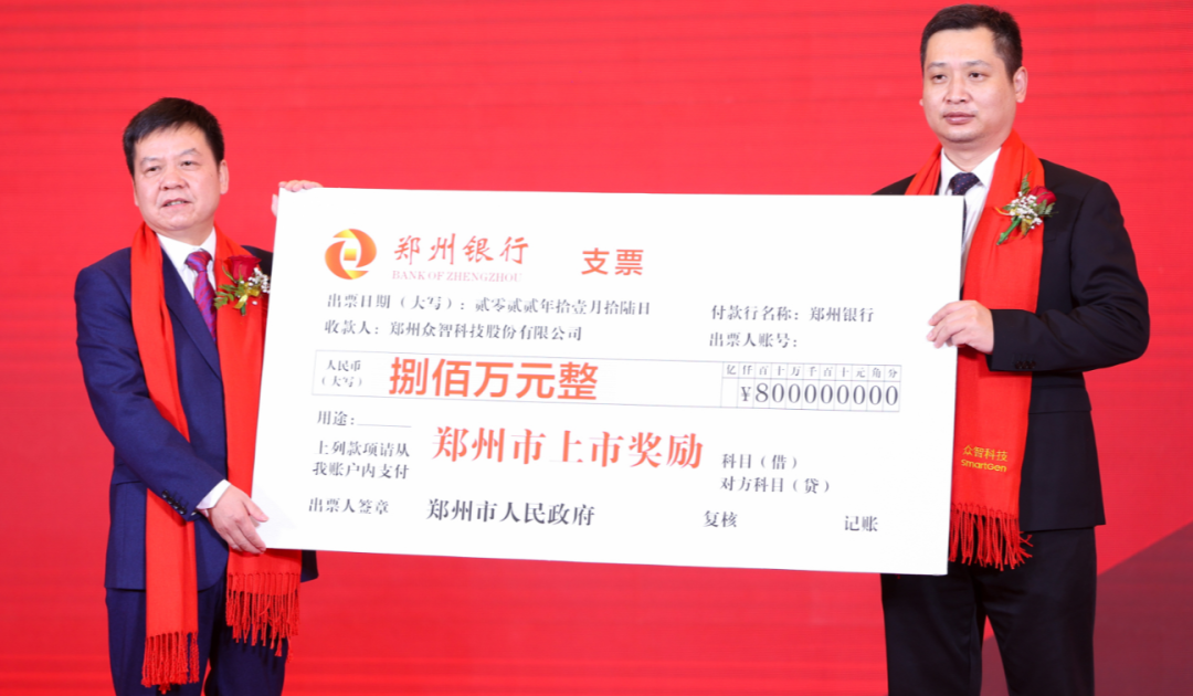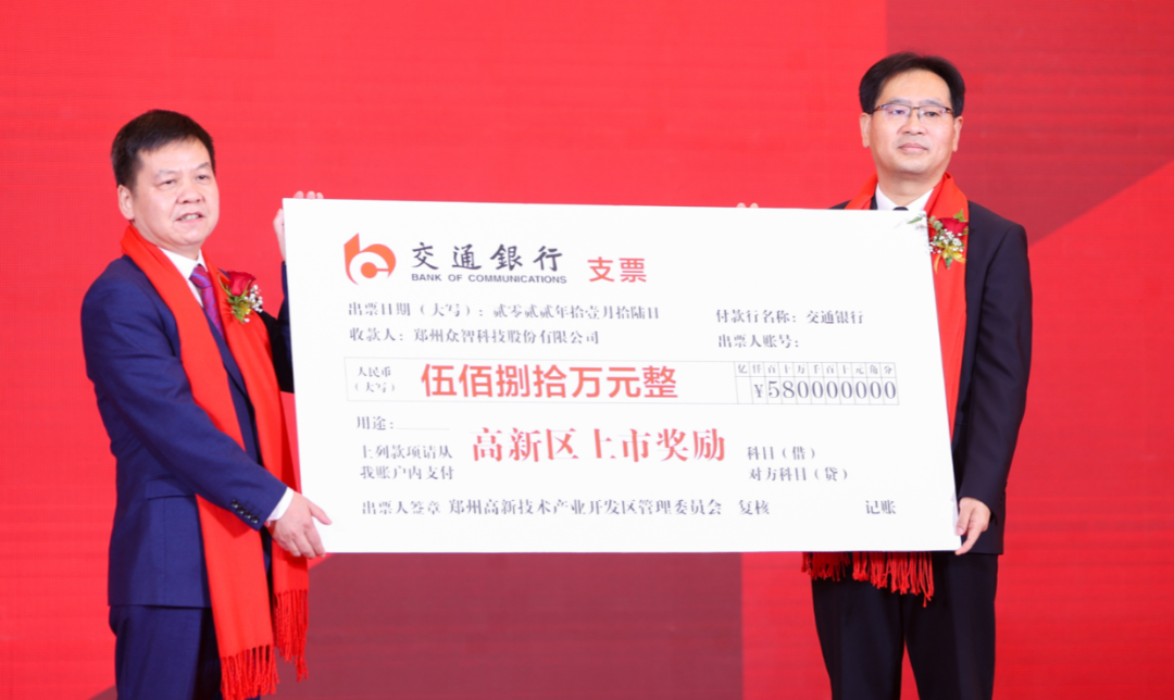 上市仪式上,郑州市及高新区分别为众智科技颁发上市奖励800万元、580万元。