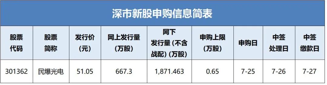 2023年7月25日,深圳民爆光电股份有限公司(简称:民爆光电)将通过深交所网下发行电子平台和交易系统发行新股,具体信息如下。