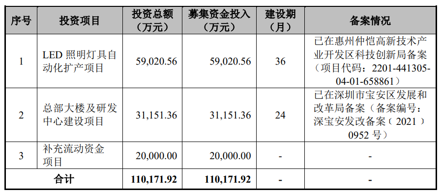 民爆光电本次发行募集资金总额为133,597.85万元,扣除本次发行费用后实际募集资金净额为124,298.77万元。公司募集资金净额比原计划多14,126.85万元。民爆光电2023年7月31日披露的招股说明书显示,公司拟募集资金110,171.92万元,用于LED照明灯具自动化扩产项目、总部大楼及研发中心建设项目、补充流动资金项目。