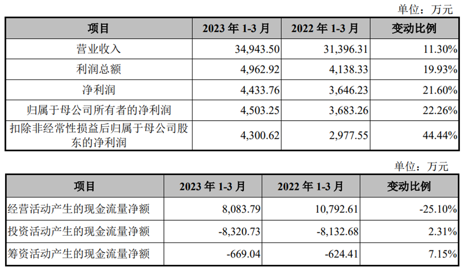 2023年1-3月,民爆光电实现营业收入34,943.50万元,较上年同期增长11.30%;实现净利润4,433.76万元,较上年同期增长21.60%;归属于母公司所有者的净利润4,503.25万元,较上年同期增长22.26%;扣除非经常性损益后归属于母公司股东的净利润4,300.62万元,较上年同期增长44.44%;经营活动产生的现金流量净额为8,083.79万元,较上年同期下降25.10%。