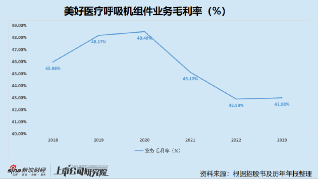 然而,该业务的盈利能力或正在衰减。2018年至2020年,美好医疗呼吸机组件毛利率分别为45.96%、48.17%、48.48%,均保持在45%以上且呈现稳步上升趋势。而自2020年起,业务毛利率出现拐点,2021年、2022年毛利率分别为45.1%和42.88%,2023年在低基数情况下仅小幅回升0.1个百分点至42.98%。