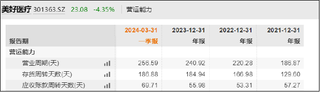 因此,美好医疗呼吸机组件业务毛利率进一步下探,或说明产品已出现销售不畅或成本不能有效传导至下游。从营运情况看,美好医疗的营运能力也逐年下降,2021年至今存货周转天数、营收账款周转天数均出现明显延长。