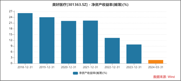 从净资产收益率看,2021年至今,美好医疗的摊薄净资产收益率持续走低,盈利能力已大幅减弱。