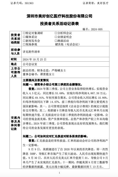 美好医疗表示,汇兑损益是经常性损益,汇率的波动会对公司的净利润产9月9日,美联储进行了自2020年以来的首次降息,即一次性降息50BP,导致汇率市场产生了较大波动,人民币出现短期快速升值。9月30日,在岸人民币兑美元汇率升值到7.01,导致公司9月单月产生了未实现的汇兑损失。十一期间,伴随美国9月劳工数据等经济数据的披露,美元出现小幅反弹,最新数据回到7.13左右。