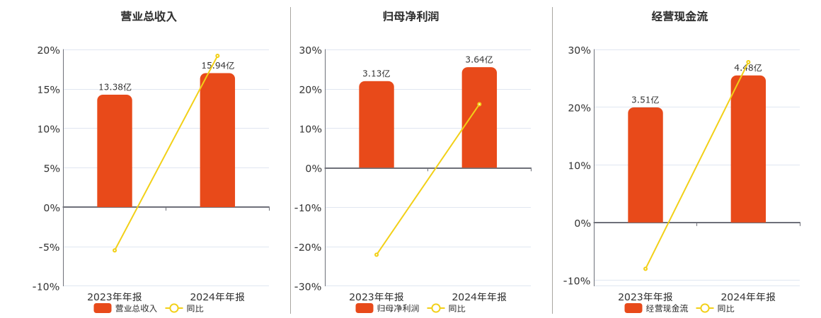公司营业总收入为15.94亿元。归母净利润为3.64亿元。经营活动现金净流入为4.48亿元。
