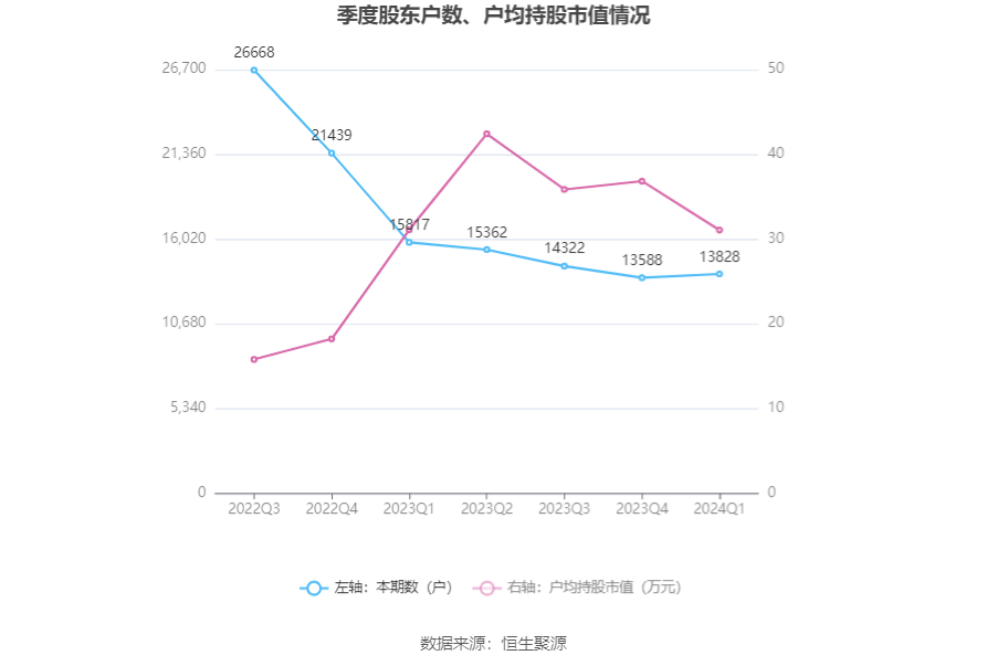 筹码集中度方面,截至2024年一季度末,公司股东总户数为1.38万户,较上年末增长了240户,增幅1.77%;户均持股市值由上年末的36.84万元下降至31.07万元,降幅为15.66%。