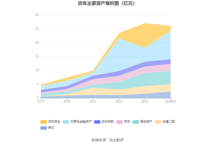 资产重大变化方面,截至2024年一季度末,公司货币资金较上年末减少80.55%,占公司总资产比重下降26.18个百分点;交易性金融资产较上年末增加104.09%,占公司总资产比重上升20.91个百分点;其他非流动资产较上年末增加1388.05%,占公司总资产比重上升2.24个百分点;固定资产较上年末增加2.24%,占公司总资产比重上升1.04个百分点。