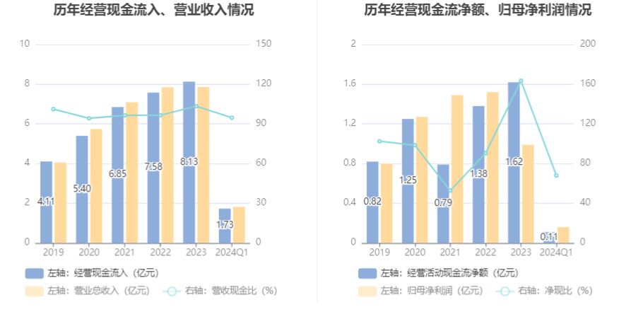 2024年第一季度,公司营业收入现金比为94.70%,净现比为68.02%。