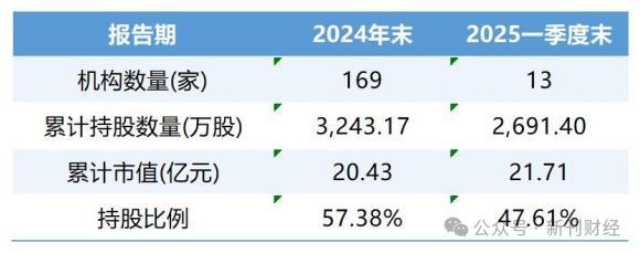 投资者信心方面,截至2025年一季度末,相比于2024年底,机构投资者数量从169家减少至13家,持股数从3243.17万下降至2691.40万,持股比例也从57.38%下降至47.61%,减少了9.77个百分点,反映出机构投资者对公司的热情有所消退。
