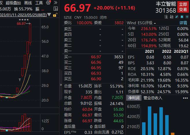 盘面上,丰立智能再度录得20%涨停,该股6个交易日内录得5个涨停板,累计涨超190%。