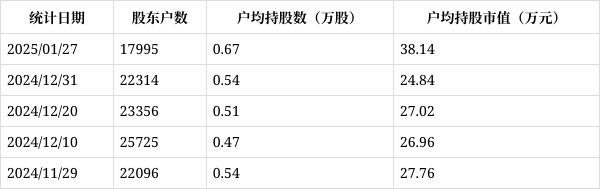 从2月11日公开信息显示,丰立智能截至2025年1月27日公司股东户数为1.80万户,较上期(2024年12月31日)减少3671户,降幅为16.94%,持股趋于集中。