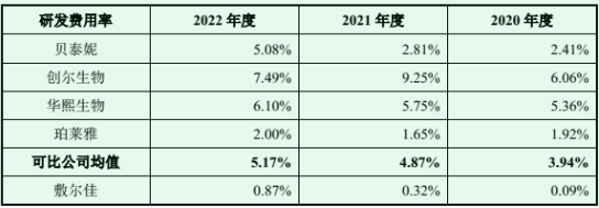 相交于去年贝泰妮、华熙生物、珀莱雅、创尔生物4家可比公司研发费率均值5.17%,哪怕是投入相对较少的巨子生物2022年研发费用也达到了4404.3万元,敷尔佳“重营销”而“轻研发”问题也显而易见。