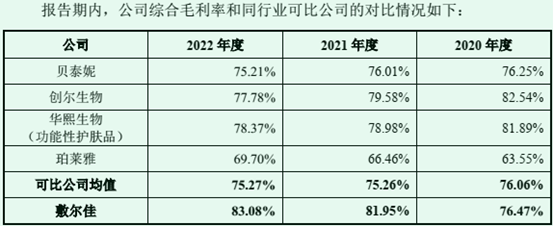 对比贝泰妮、华熙生物、珀莱雅、创尔生物4家可比公司毛利率去年均值75.27%。