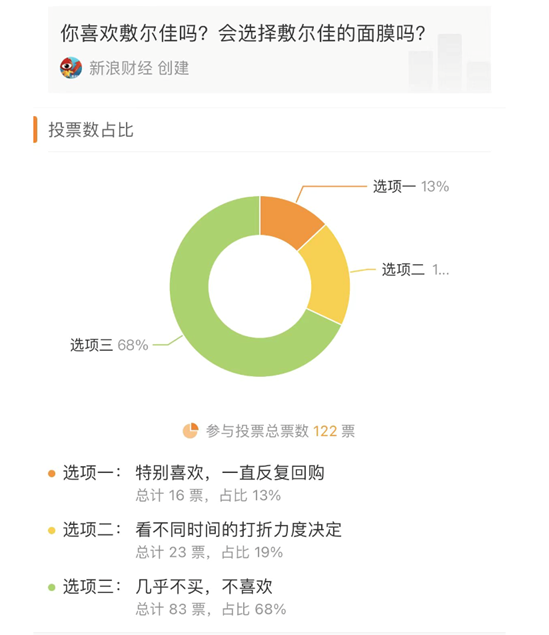 从C端消费者的角度来看,敷尔佳的口碑似乎并不好,一份由新浪财经发起的投票可以看出,敷尔佳在大众眼里的喜爱度并不高。