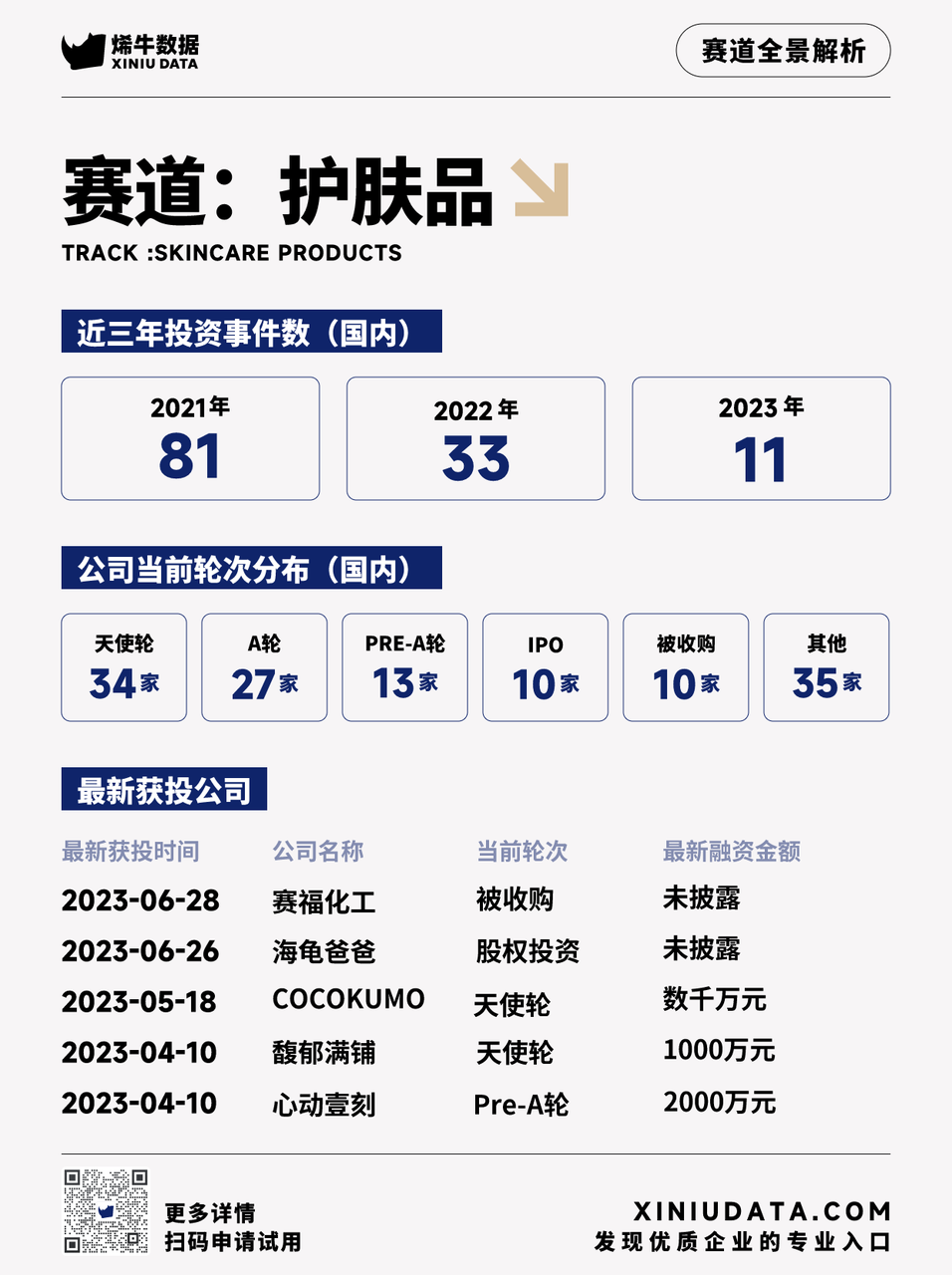 根据烯牛数据的信息,目前收录了全球764家从事护肤品相关业务的企业,其中国内有570家。近三年的投资事件数为125起,其中2021年81起,2022年33起,2023年度截止目前11起。公司当前轮次分布为天使轮34家,A轮27家,pre-A轮13家,IPO10家,被收购10家,其他35家。