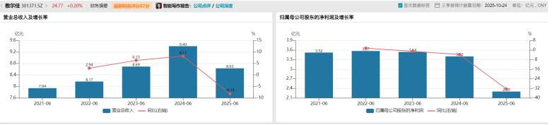 具体来看,公司营业收入从2024年同期的9.40亿元降至8.63亿元,同比下降8.15%,为上市以来首次半年度营收负增长。同期,公司归母净利润从3.41亿元降至2.30亿元,同比降幅扩大至32.54%,扣非净利润更是近乎腰斩下降幅度高达48.66%,盈利水平创上市以来同期最低。