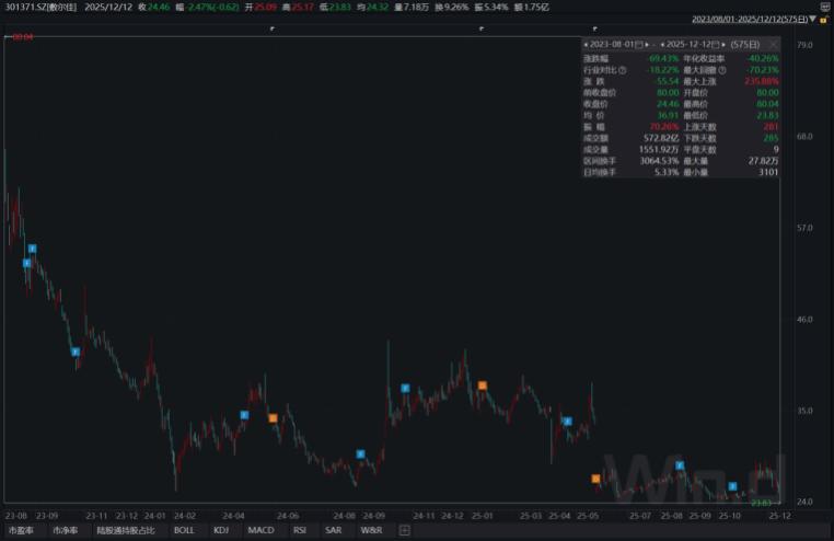 2025年12月15日收盘后,哈尔滨 敷尔佳 科技股份有限公司(下称“ 敷尔佳 ”,股票代码:301371.SZ)股价报收23.88元,当日下跌2.37%,延续了整体下行趋势。与发行价格相比当前股价已遭“腰斩”。