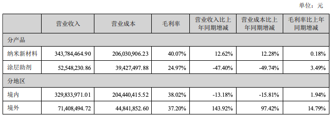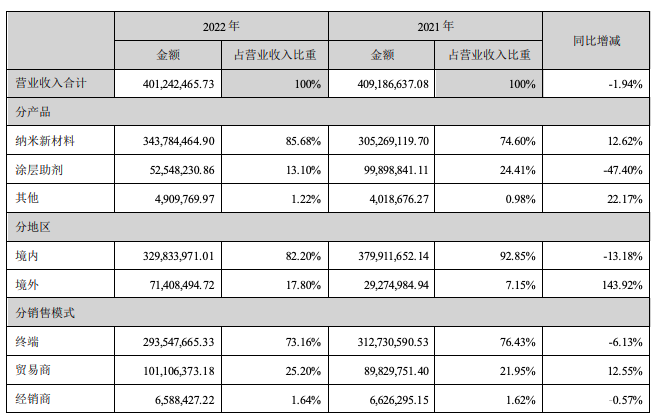 2022年,凌玮科技纳米新材料收入3.439亿万元,同比增长12.62%,有效填补了代理BYK产品收入的下滑。并且,由于纳米新材料毛利率远高于代理的BYK产品,使得公司在市场竞争加剧前提下,整体净利润取得同比增长34.71%的较好表现。