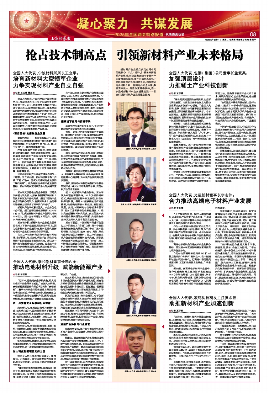 “近年来,新材料技术持续推动新能源、高端制造、电子信息、医药健康等相关领域高质量发展。着眼未来,推动新材料产业加速创新、持续创新至为关键。”全国人大代表、凌玮科技研发主任黄水波在今年全国两会提出建议。