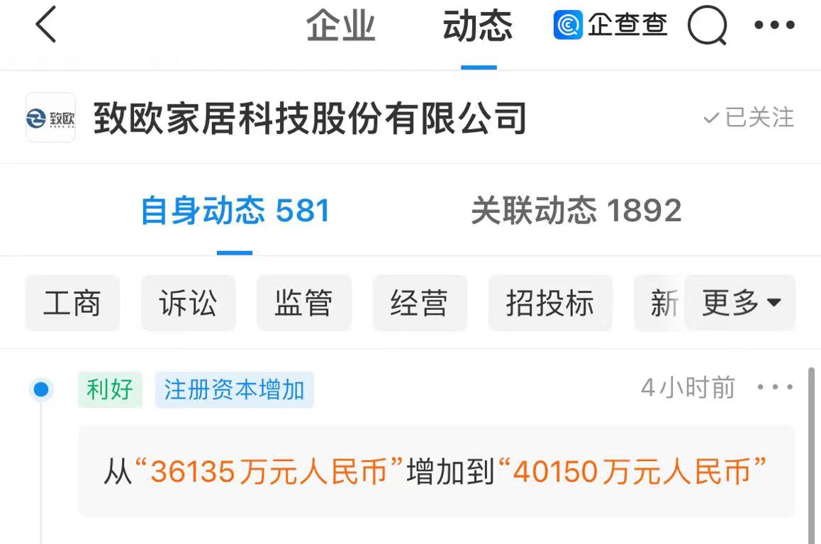 9月21日,致欧家居科技股份有限公司(以下简称“致欧科技”)注册资本发生变更,从3.61亿元增加至4.02亿元,增幅11.36%。